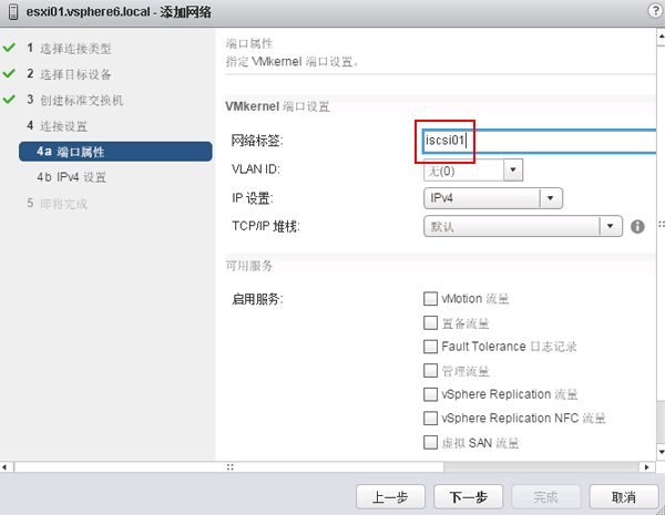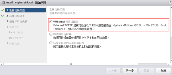 至此一个虚拟交换机添加完成,使用相同方法再创建第二个虚拟交换机,此交换机与vmnic2绑定,与之前不同的为网络标签、IP地址的配置。